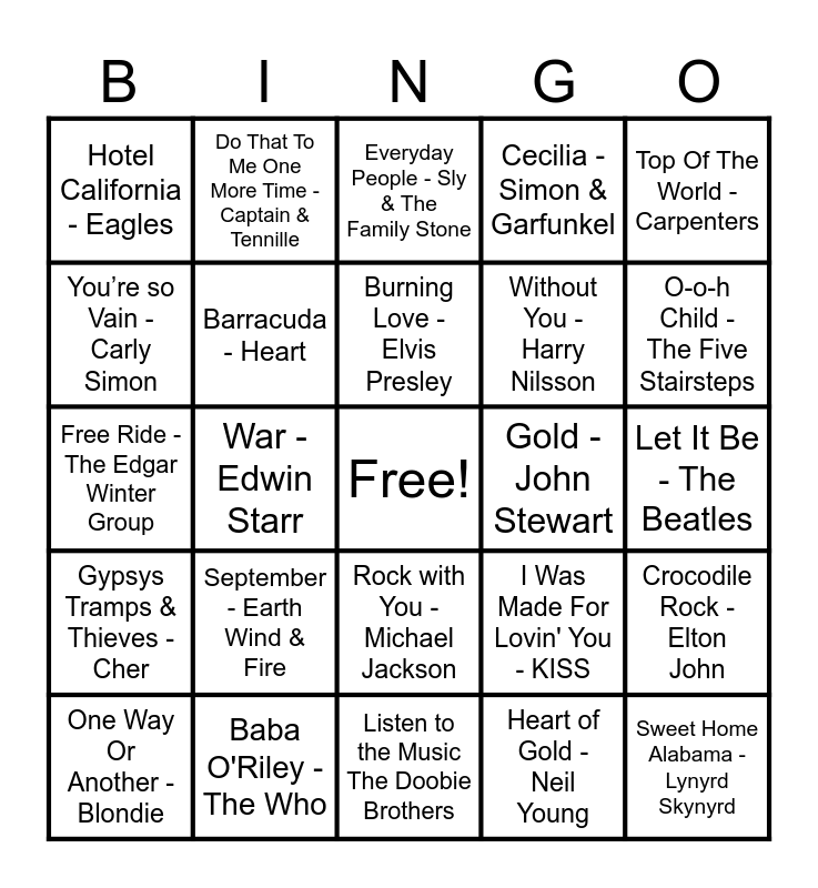 This bingo card has a free space and 84 words: Some Kind Of Wonderful - Grand Funk Railroad, Takin’ Care of Business - Bachman-Turner Overdrive, Everyday People - Sly & The Family Stone, Rich Girl - Daryl Hall & John Oates, Immigrant Song - Led Zeppelin, (Don’t Fear) The Reaper - Blue Öyster Cult, I Can See Clearly Now - Johnny Nash, It's A Man's Man's Man's World - James Brown, My Sweet Lord - George Harrison, How Sweet It Is - James Taylor, Beast Of Burden - The Rolling Stones, Iron Man - Black Sabbath, Barracuda - Heart, Gold - John Stewart, Stayin Alive - Bee Gees, Hotel California - Eagles, One Way Or Another - Blondie, You’re so Vain - Carly Simon, Dream On - Aerosmith, More Than A Feeling - Boston, Jolene - Dolly Parton, Without You - Harry Nilsson, Sweet Home Alabama - Lynyrd Skynyrd, Ring My Bell - Anita Ward, War - Edwin Starr, Don't Stop Me Now - Queen, Hold the Line - TOTO, Piano Man - Billy Joel, I Am Woman - Helen Reddy, Hot Stuff - Donna Summer, September - Earth Wind & Fire, You Make Me Feel Like Dancing - Leo Sayer, Roxanne - The Police, Free Ride - The Edgar Winter Group, Evil Woman - Electric Light Orchestra, I Wanna Be Sedated - Ramones, Listen to the Music The Doobie Brothers, Best of My Love - The Emotions, O-o-h Child - The Five Stairsteps, Gypsys Tramps & Thieves - Cher, Bad Bad Leroy Brown - Jim Croce, Y.M.C.A. - Village People, London Calling - The Clash, Stuck In The Middle With You - Stealers Wheel, Sundown - Gordon Lightfoot, Vincent - Don McLean, Do That To Me One More Time - Captain & Tennille, I Will Survive - Gloria Gaynor, No Sugar Tonight - The Guess Who, You Sexy Thing - Hot Chocolate, Runnin' with the Devil - Van Halen, I Was Made For Lovin' You - KISS, Cecilia - Simon & Garfunkel, No More Mr. Nice Guy - Alice Cooper, Come and Get Your Love - Redbone, Me and Bobby McGee - Janis Joplin, Baba O'Riley - The Who, Burning Love - Elvis Presley, It’s A Long Way to the Top - AC/DC, Let It Be - The Beatles, Have You Ever Seen The Rain - Creedence Clearwater Revival, Big Yellow Taxi - Joni Mitchell, Cold as Ice - Foreigner, Me and Mrs. Jones - Billy Paul, Superstition - Stevie Wonder, The Night the Lights Went Out - Vicki Lawrence, Low Rider - War, Get Up Stand Up - The Wailers, Top Of The World - Carpenters, АВС - The Jackson 5, Crocodile Rock - Elton John, Ooh La La - Faces, Time - Pink Floyd, Ain’t No Sunshine - Bill Weathers, Rock with You - Michael Jackson, Heart of Gold - Neil Young, That's the Way (I Like It) - K & The Sunshine Band, Give A Little Bit - Supertramp, Voulez-Vous - ABBA, Dreams - Fleetwood Mac, It’s Too Late - Carole King, Midnight Train to Georgia - Gladys Knight & The Pips, Hooked On A Feeling - Blue Swede and Carry on Wayward Son - Kansas.