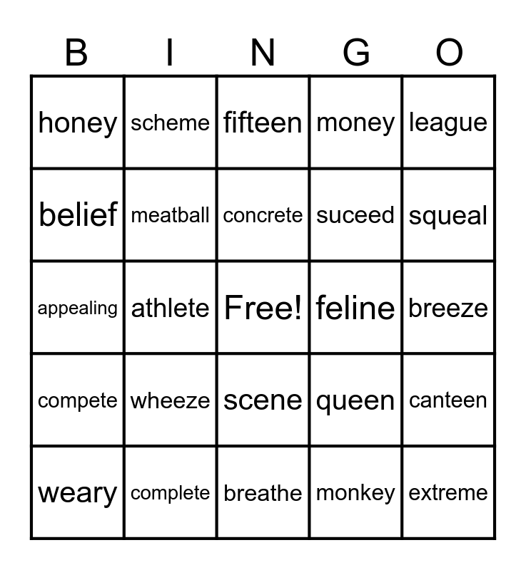This bingo card has a free space and 25 words: wheeze, breathe, concrete, weary, league, honey, belief, scheme, feline, scene, suceed, appealing, queen, canteen, meatball, seedling, breeze, fifteen, squeal, athlete, extreme, complete, compete, money and monkey.