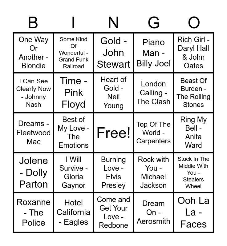 This bingo card has a free space and 84 words: I Wanna Be Sedated - Ramones, Without You - Harry Nilsson, Gold - John Stewart, O-o-h Child - The Five Stairsteps, Get Up Stand Up - The Wailers, Midnight Train to Georgia - Gladys Knight & The Pips, Bad Bad Leroy Brown - Jim Croce, Cold as Ice - Foreigner, My Sweet Lord - George Harrison, Big Yellow Taxi - Joni Mitchell, You Make Me Feel Like Dancing - Leo Sayer, How Sweet It Is - James Taylor, Time - Pink Floyd, Top Of The World - Carpenters, Vincent - Don McLean, One Way Or Another - Blondie, Roxanne - The Police, I Can See Clearly Now - Johnny Nash, АВС - The Jackson 5, Sundown - Gordon Lightfoot, Crocodile Rock - Elton John, London Calling - The Clash, Ooh La La - Faces, Cecilia - Simon & Garfunkel, Best of My Love - The Emotions, Hot Stuff - Donna Summer, The Night the Lights Went Out - Vicki Lawrence, No More Mr. Nice Guy - Alice Cooper, Runnin' with the Devil - Van Halen, You Sexy Thing - Hot Chocolate, I Will Survive - Gloria Gaynor, More Than A Feeling - Boston, Stayin Alive - Bee Gees, Dreams - Fleetwood Mac, Sweet Home Alabama - Lynyrd Skynyrd, Everyday People - Sly & The Family Stone, Come and Get Your Love - Redbone, Evil Woman - Electric Light Orchestra, Beast Of Burden - The Rolling Stones, Jolene - Dolly Parton, Hooked On A Feeling - Blue Swede, Low Rider - War, War - Edwin Starr, Do That To Me One More Time - Captain & Tennille, I Am Woman - Helen Reddy, Don't Stop Me Now - Queen, Some Kind Of Wonderful - Grand Funk Railroad, September - Earth Wind & Fire, Immigrant Song - Led Zeppelin, It’s A Long Way to the Top - AC/DC, It’s Too Late - Carole King, Rock with You - Michael Jackson, Piano Man - Billy Joel, That's the Way (I Like It) - K & The Sunshine Band, Carry on Wayward Son - Kansas, Give A Little Bit - Supertramp, Hotel California - Eagles, Heart of Gold - Neil Young, Listen to the Music The Doobie Brothers, Ring My Bell - Anita Ward, No Sugar Tonight - The Guess Who, Have You Ever Seen The Rain - Creedence Clearwater Revival, Hold the Line - TOTO, Ain’t No Sunshine - Bill Weathers, Free Ride - The Edgar Winter Group, Baba O'Riley - The Who, Superstition - Stevie Wonder, You’re so Vain - Carly Simon, Rich Girl - Daryl Hall & John Oates, Gypsys Tramps & Thieves - Cher, Stuck In The Middle With You - Stealers Wheel, Me and Mrs. Jones - Billy Paul, I Was Made For Lovin' You - KISS, Me and Bobby McGee - Janis Joplin, Burning Love - Elvis Presley, Dream On - Aerosmith, Y.M.C.A. - Village People, Takin’ Care of Business - Bachman-Turner Overdrive, Barracuda - Heart, (Don’t Fear) The Reaper - Blue Öyster Cult, Let It Be - The Beatles, Iron Man - Black Sabbath, Voulez-Vous - ABBA and It's A Man's Man's Man's World - James Brown.