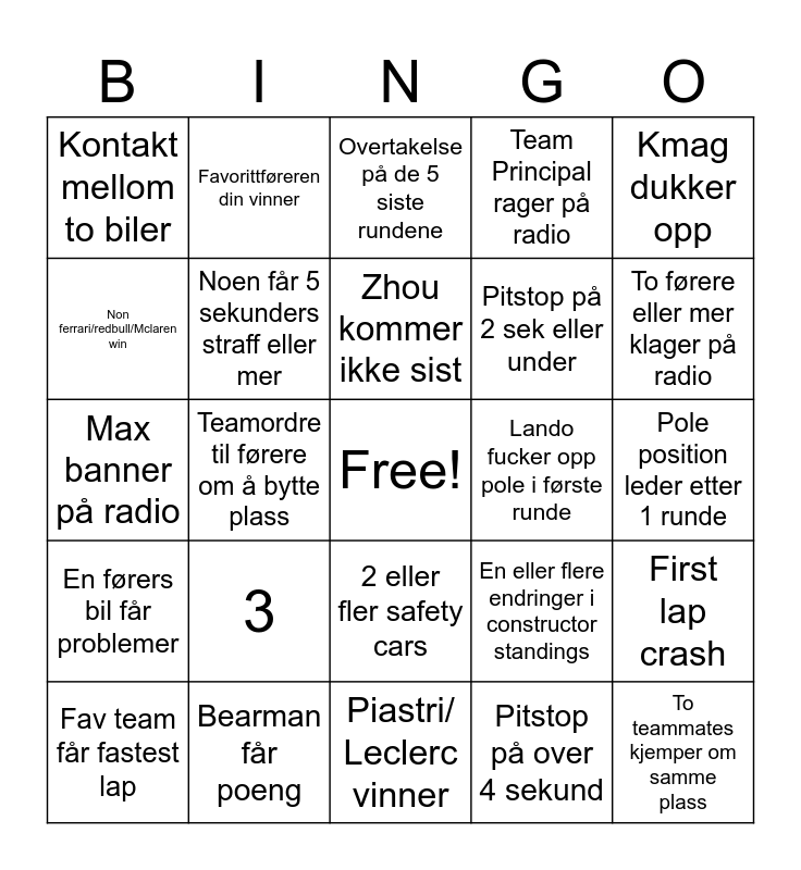 This bingo card has a free space and 24 words: 3, Bearman får poeng, Zhou kommer ikke sist, Fav team får fastest lap, Kmag dukker opp, Kontakt mellom to biler, Non ferrari/redbull/Mclaren win, Favorittføreren din vinner, Lando fucker opp pole i første runde, 2 eller fler safety cars, Pitstop på 2 sek eller under, Max banner på radio, En eller flere endringer i constructor standings, First lap crash, Noen får 5 sekunders straff eller mer, Pitstop på over 4 sekund, Pole position leder etter 1 runde, Overtakelse på de 5 siste rundene, To førere eller mer klager på radio, Teamordre til førere om å bytte plass, To teammates kjemper om samme plass, En førers bil får problemer, Team Principal rager på radio and Piastri/ Leclerc vinner.