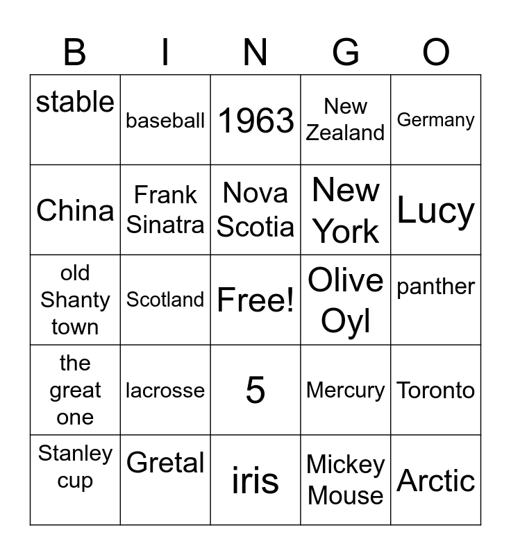 This bingo card has a free space and 34 words: Eve, Mickey Mouse, Bethlehem, Ark, the great one, Frank Sinatra, Germany, Stanley cup, baseball, Anne of green gables, Nova Scotia, 1963, Tonto, Delilah, Olive Oyl, Lucy, Gretal, old Shanty town, lacrosse, Mercury, 5, rooster, stable, panther, iris, Arctic, New Zealand, Alberta, New York, China, Egypt, Scotland, Toronto and Japan.