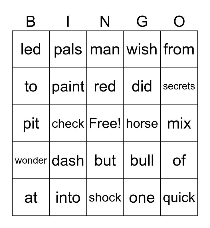 This bingo card has a free space and 24 words: at, dash, red, one, from, led, pals, man, horse, mix, pit, paint, bull, of, to, into, shock, wish, secrets, wonder, check, but, did and quick.