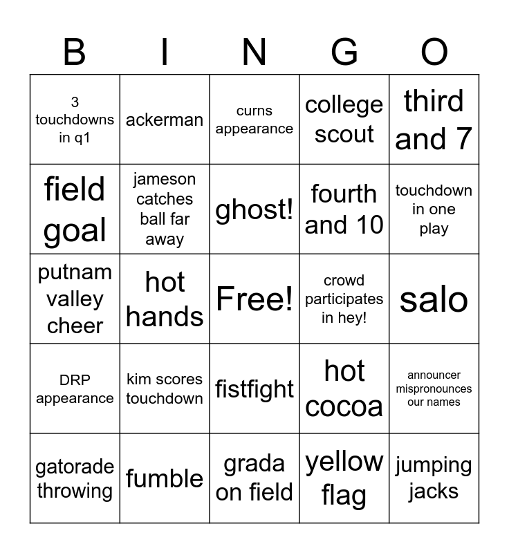 This bingo card has a free space and 24 words: kim scores touchdown, fumble, ghost!, gatorade throwing, third and 7, 3 touchdowns in q1, field goal, ackerman, crowd participates in hey!, fistfight, fourth and 10, putnam valley cheer, hot cocoa, announcer mispronounces our names, jameson catches ball far away, yellow flag, salo, curns appearance, touchdown in one play, hot hands, jumping jacks, DRP appearance, college scout and grada on field.