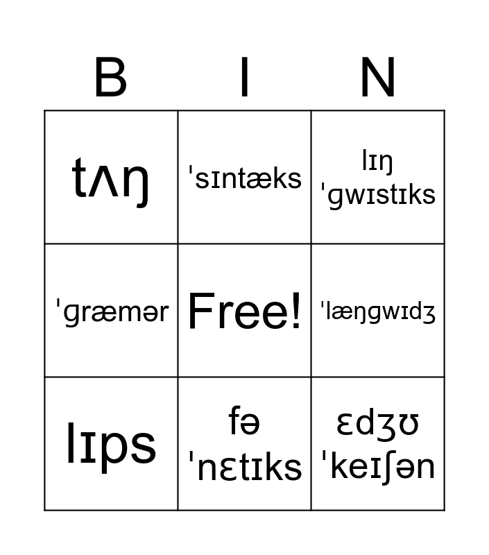 This bingo card has a free space and 8 words: ˈlæŋɡwɪdʒ, lɪŋˈɡwɪstɪks, ˈsɪntæks, lɪps, tʌŋ, ɛdʒʊˈkeɪʃən, ˈɡræmər and fəˈnɛtɪks.