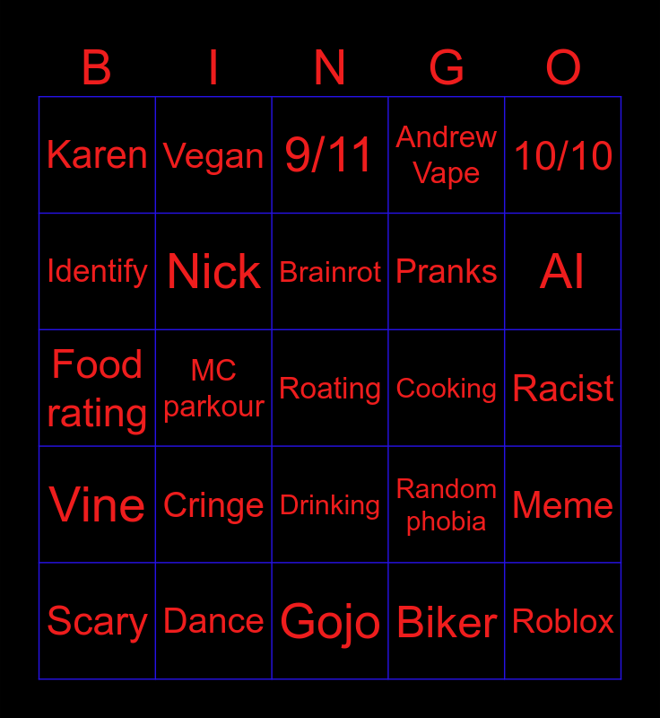 This bingo card has a free space and 24 words: Cringe, Dance, Brainrot, Scary, 10/10, Karen, Identify, Vegan, Cooking, Drinking, Pranks, Food rating, Random phobia, Meme, Nick, Biker, Racist, 9/11, AI, MC parkour, Roblox, Vine, Andrew Vape and Gojo.