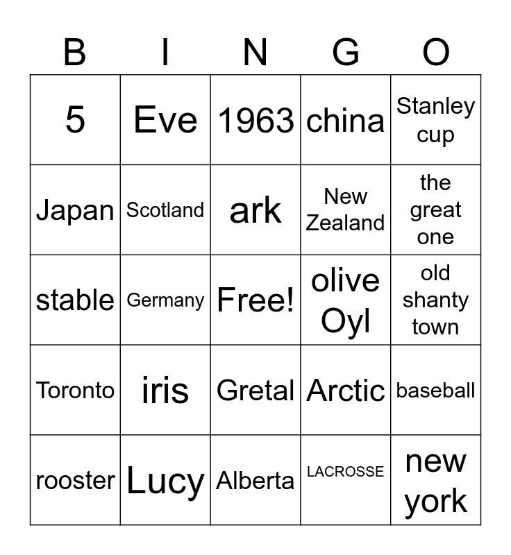 This bingo card has a free space and 34 words: BETHLEHEM, LACROSSE, Nova Scotia, panther, Toronto, Scotland, Stanley cup, rooster, Eve, Mickey mouse, ark, 1963, tonto, Delilah, olive Oyl, the great one, Lucy, stable, iris, Arctic, Gretal, mercury, 5, old shanty town, Alberta, new york, china, egypt, New Zealand, Japan, Frank Sinatra, Germany, baseball and Anne of Green gabels.