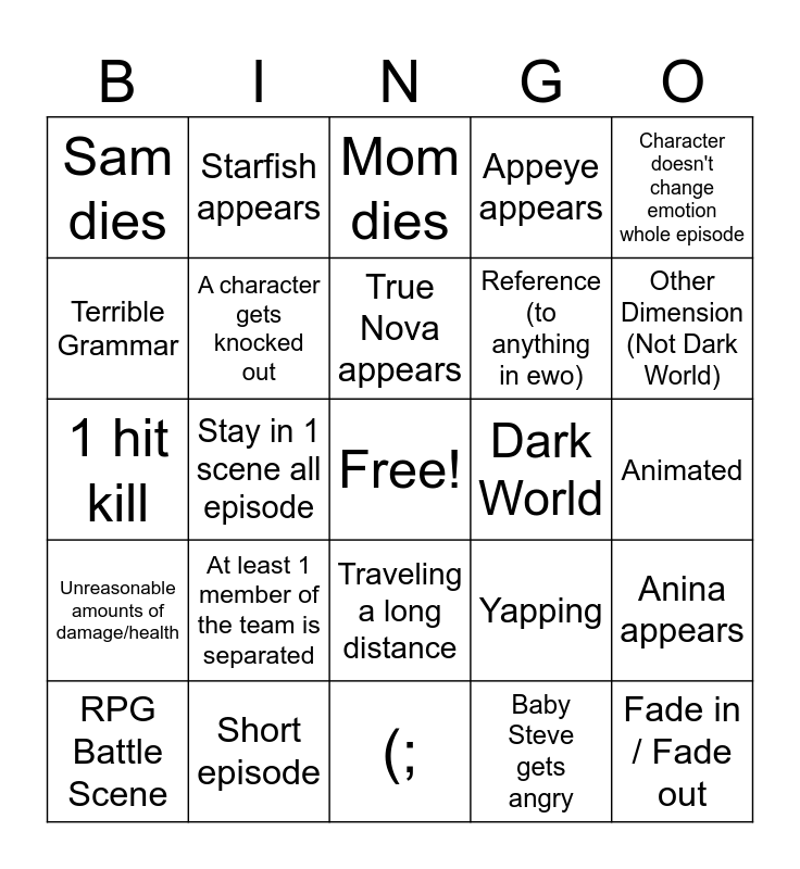 This bingo card has a free space and 29 words: RPG Battle Scene, FF Music, Stay in 1 scene all episode, Fight Scene (No Health Bars), Sam dies, Mom dies, A character gets knocked out, At least 1 member of the team is separated, Dark World, Short episode, Animated, Fade in / Fade out, (;, Baby Steve gets angry, Other Dimension (Not Dark World), Sleeping, Traveling a long distance, Unreasonable amounts of damage/health, Character doesn't change emotion whole episode, 1 hit kill, Yapping, Epilepsy, Reference (to anything in ewo), Terrible Grammar, Appeye appears, Starfish appears, Anina appears, True Nova appears and A tree shows up.