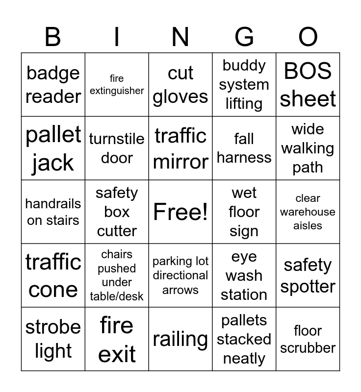 This bingo card has a free space and 26 words: parking lot directional arrows, pallets stacked neatly, traffic mirror, fire exit, BOS sheet, badge reader, pallet jack, fire extinguisher, clear warehouse aisles, eye wash station, fall harness, handrails on stairs, safety spotter, strobe light, safety box cutter, safety tape, buddy system lifting, traffic cone, cut gloves, floor scrubber, wide walking path, railing, wet floor sign, chairs pushed under table/desk, turnstile door and fire alarm pull.