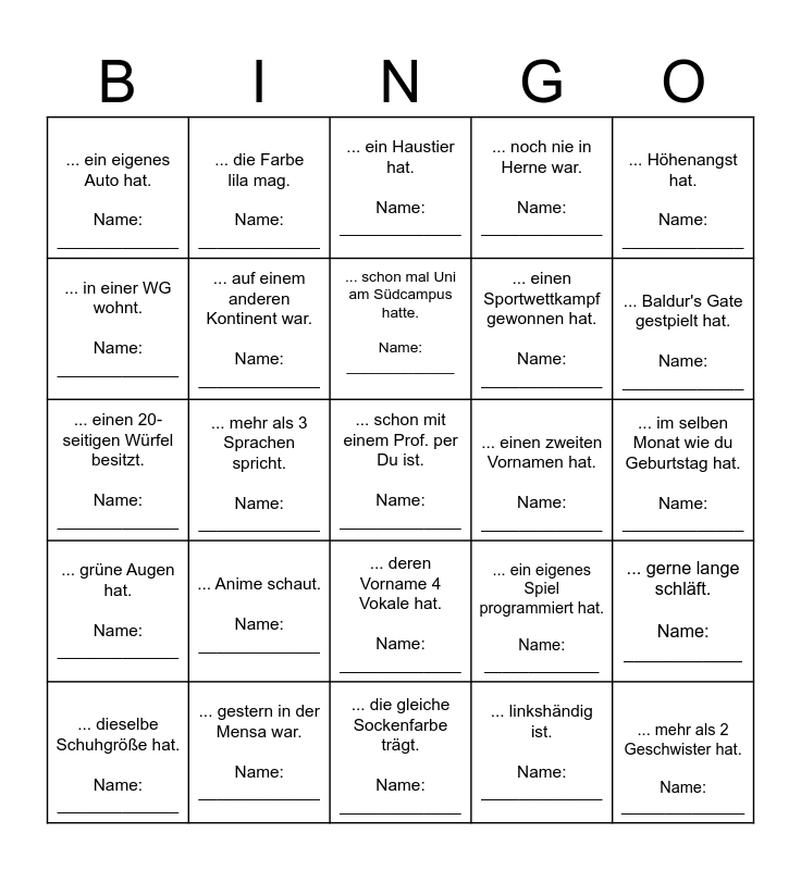 This bingo card has 33 words: ... mehr als 2 Geschwister hat. Name: ______________, ... an der Uni angestellt ist. Name: _____________, ... mehr als 3 Sprachen spricht. Name: _____________, ... kein WhatsApp hat. Name: _____________, ... grüne Augen hat. Name: _____________, ... auf einem anderen Kontinent war. Name: _____________, ... Höhenangst hat. Name: _____________, ... dieselbe Schuhgröße hat. Name: _____________, ... die Farbe lila mag. Name: _____________, ... ein Tattoo hat. Name: _____________, ... schon mal Uni am Südcampus hatte. Name: _____________, ... ein Haustier hat. Name: _____________, ... mit den Ohren wackeln kann. Name: _____________, ... C# beherrscht. Name: _____________, ... einen zweiten Vornamen hat. Name: _____________, ... Baldur's Gate gestpielt hat. Name: _____________, ... gestern in der Mensa war. Name: _____________, ... einen 20-seitigen Würfel besitzt. Name: _____________, ... Anime schaut. Name: _____________, ... ein eigenes Spiel programmiert hat. Name: _____________, ... deren Vorname 4 Vokale hat. Name: _____________, ... gerne Bücher liest. Name: _____________, ... ein eigenes Auto hat. Name: _____________, ... im selben Monat wie du Geburtstag hat. Name: _____________, ... die gleiche Sockenfarbe trägt. Name: _____________, ... schon mit einem Prof. per Du ist. Name: _____________, ... noch nie in Herne war. Name: _____________, ... einen Sportwettkampf gewonnen hat. Name: _____________, ... in einer WG wohnt. Name: _____________, ... gerne lange schläft. Name: ____________, ... in einem anderen Land geboren wurde. Name: _______________, ... linkshändig ist. Name: _____________ and ... ein Instru- ment spielt. Name: _____________.