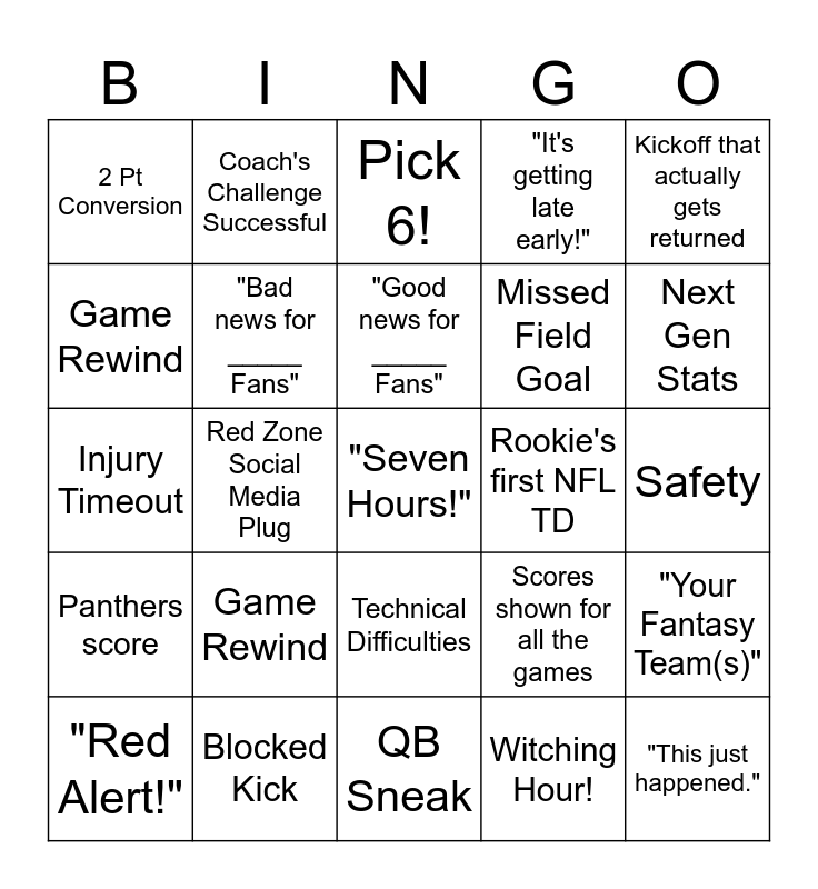 This bingo card has a free space and 24 words: Game Rewind, Blocked Kick, "Good news for _____ Fans", "Red Alert!", Kickoff that actually gets returned, 2 Pt Conversion, Game Rewind, Coach's Challenge Successful, Rookie's first NFL TD, Technical Difficulties, Missed Field Goal, Injury Timeout, Scores shown for all the games, "Your Fantasy Team(s)", "Bad news for _____ Fans", Witching Hour!, Safety, Pick 6!, Next Gen Stats, Red Zone Social Media Plug, "This just happened.", Panthers score, "It's getting late early!" and QB Sneak.