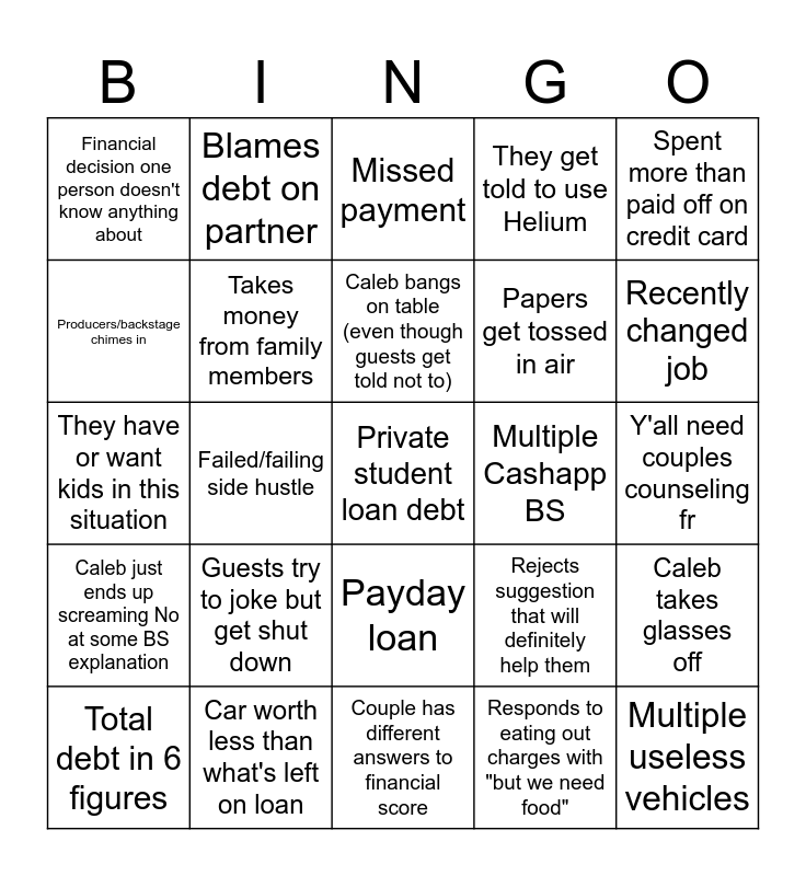 This bingo card has 25 words: Caleb just ends up screaming No at some BS explanation, Car worth less than what's left on loan, Private student loan debt, Responds to eating out charges with "but we need food", Spent more than paid off on credit card, Financial decision one person doesn't know anything about, Blames debt on partner, Missed payment, Multiple Cashapp BS, Caleb takes glasses off, Producers/backstage chimes in, Takes money from family members, Couple has different answers to financial score, Rejects suggestion that will definitely help them, Recently changed job, Total debt in 6 figures, Failed/failing side hustle, Caleb bangs on table (even though guests get told not to), Papers get tossed in air, Y'all need couples counseling fr, They have or want kids in this situation, Guests try to joke but get shut down, Payday loan, They get told to use Helium and Multiple useless vehicles.