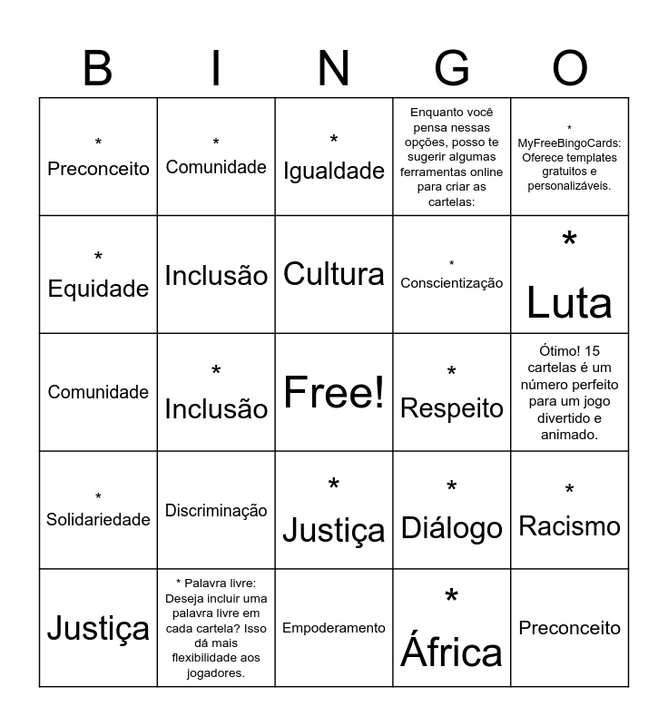 This bingo card has a free space and 70 words: Vamos criar suas 15 cartelas de bingo 5x5!, Ótimo! 15 cartelas é um número perfeito para um jogo divertido e animado., Para começar, vamos definir alguns detalhes:, * Distribuição das palavras: Gostaria que as palavras fossem distribuídas aleatoriamente em cada cartela, ou você tem alguma preferência específica (por exemplo, palavras mais difíceis no centro)?, * Palavra livre: Deseja incluir uma palavra livre em cada cartela? Isso dá mais flexibilidade aos jogadores., * Repetição de palavras: Você gostaria que as mesmas palavras se repetissem em cartelas diferentes, ou prefere que cada cartela seja única?, Enquanto você pensa nessas opções, posso te sugerir algumas ferramentas online para criar as cartelas:, * BingoBaker: Uma ótima opção para criar cartelas personalizadas com diversos temas e designs., * MyFreeBingoCards: Oferece templates gratuitos e personalizáveis., Se preferir criar as cartelas em uma planilha, posso te fornecer um modelo básico no Excel ou Google Sheets. Assim, você terá mais controle sobre a, * Racismo, * Discriminação, * Preconceito, * Igualdade, * Diversidade, * Inclusão, * Justiça, * Conscientização, * Empatia, * Solidariedade, * Respeito, * Diálogo, * Luta, * Resistência, * Empoderamento, * Visibilidade, * Cultura, * Cotas, * África, * Brasil, * Comunidade, * Escola, * Negro, * Indígena, * Cor, * Raça, * Etnia, * Origem, * Identidade, * Equidade, Racismo, Discriminação, Preconceito, Igualdade, Diversidade, Inclusão, Justiça, Conscientização, Empatia, Solidariedade, Respeito, Diálogo, Luta, Resistência, Empoderamento, Visibilidade, Cultura, Cotas, África, Brasil, Comunidade, Escola, Negro, Indígena, Cor, Raça, Etnia, Origem, Identidade and Equidade.