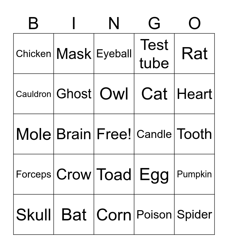 This bingo card has a free space and 24 words: Crow, Bat, Owl, Skull, Rat, Chicken, Cauldron, Mask, Candle, Toad, Cat, Mole, Egg, Pumpkin, Ghost, Poison, Tooth, Eyeball, Heart, Brain, Spider, Forceps, Test tube and Corn.