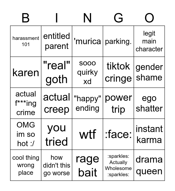 This bingo card has 25 words: you tried, rage bait, sooo quirky xd, cool thing wrong place, legit main character, harassment 101, karen, entitled parent, power trip, wtf, tiktok cringe, actual f***ing crime, :face:, instant karma, "real" goth, drama queen, ego shatter, 'murica, gender shame, actual creep, "happy" ending, how didn't this go worse, OMG im so hot :/, parking. and :sparkles: Actually Wholesome :sparkles:.