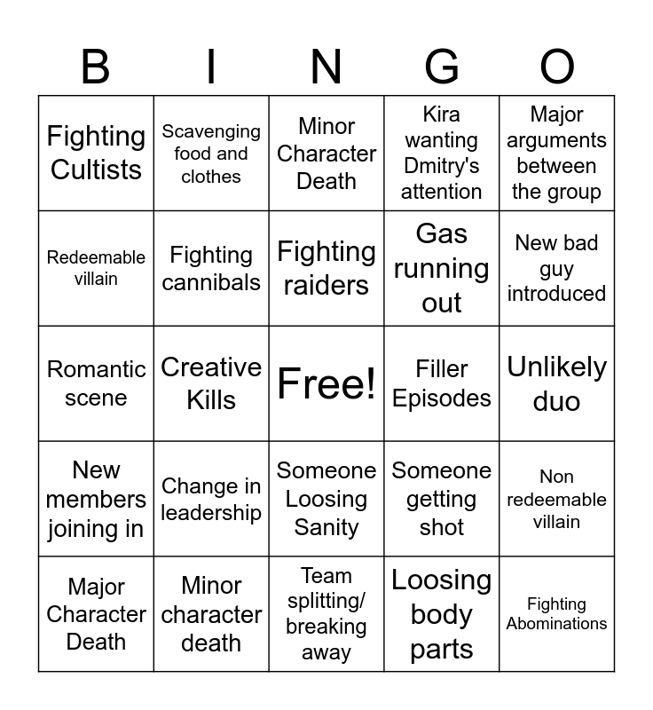 This bingo card has a free space and 24 words: Major Character Death, Change in leadership, Fighting raiders, Loosing body parts, Major arguments between the group, Fighting Cultists, Scavenging food and clothes, Minor Character Death, Filler Episodes, Unlikely duo, Romantic scene, Fighting cannibals, Someone getting shot, Non redeemable villain, Redeemable villain, Minor character death, Team splitting/ breaking away, Kira wanting Dmitry's attention, New bad guy introduced, New members joining in, Creative Kills, Someone Loosing Sanity, Gas running out and Fighting Abominations.