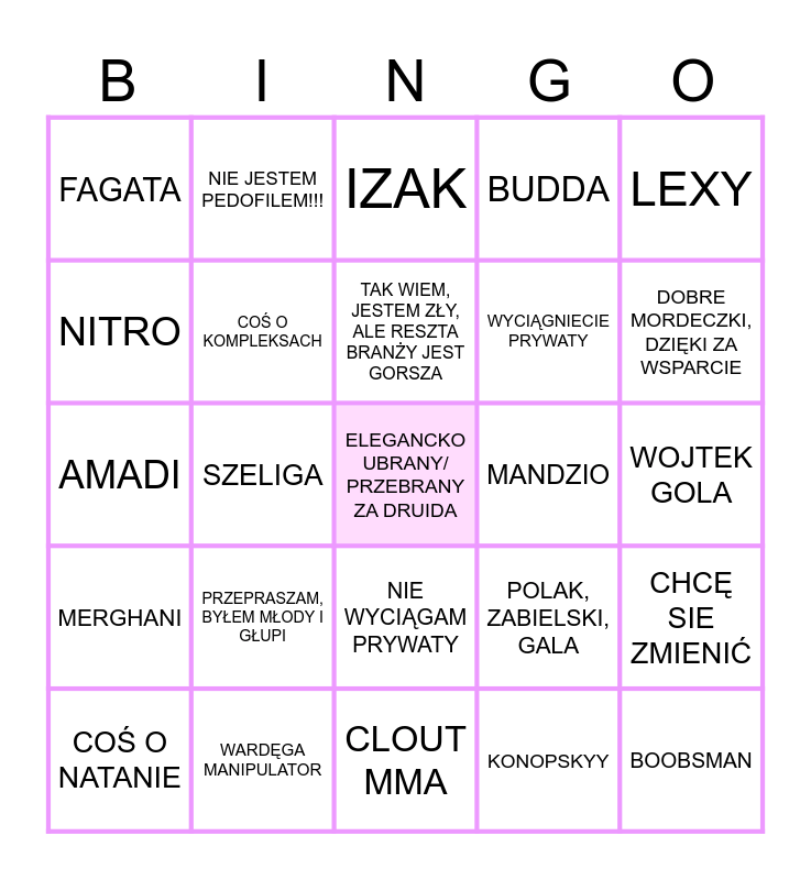 This bingo card has a free space and 24 words: PRZEPRASZAM, BYŁEM MŁODY I GŁUPI, WARDĘGA MANIPULATOR, TAK WIEM, JESTEM ZŁY, ALE RESZTA BRANŻY JEST GORSZA, COŚ O NATANIE, LEXY, FAGATA, NITRO, NIE JESTEM PEDOFILEM!!!, MANDZIO, NIE WYCIĄGAM PRYWATY, WYCIĄGNIECIE PRYWATY, AMADI, POLAK, ZABIELSKI, GALA, CHCĘ SIE ZMIENIĆ, COŚ O KOMPLEKSACH, KONOPSKYY, WOJTEK GOLA, IZAK, DOBRE MORDECZKI, DZIĘKI ZA WSPARCIE, SZELIGA, BOOBSMAN, MERGHANI, BUDDA and CLOUT MMA.