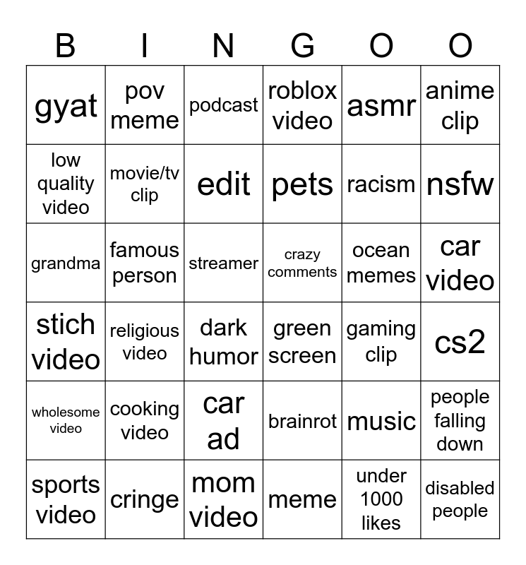 This bingo card has 36 words: brainrot, car ad, meme, low quality video, stich video, crazy comments, movie/tv clip, mom video, asmr, music, nsfw, roblox video, people falling down, famous person, pets, gyat, wholesome video, ocean memes, grandma, podcast, streamer, religious video, green screen, dark humor, gaming clip, pov meme, racism, cringe, edit, anime clip, disabled people, sports video, cs2, car video, cooking video and under 1000 likes.
