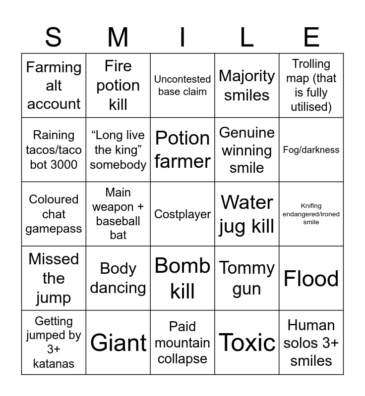 This bingo card has 25 words: Missed the jump, Giant, Costplayer, Toxic, Trolling map (that is fully utilised), Farming alt account, Fire potion kill, Uncontested base claim, Water jug kill, Flood, Raining tacos/taco bot 3000, “Long live the king” somebody, Paid mountain collapse, Tommy gun, Fog/darkness, Getting jumped by 3+ katanas, Main weapon + baseball bat, Potion farmer, Genuine winning smile, Knifing endangered/ironed smile, Coloured chat gamepass, Body dancing, Bomb kill, Majority smiles and Human solos 3+ smiles.