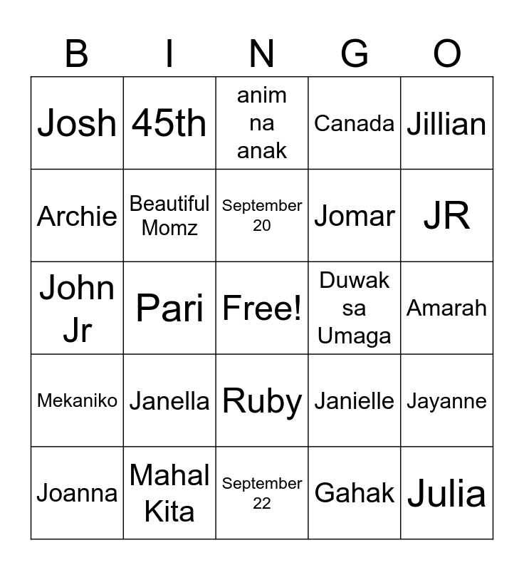 This bingo card has a free space and 71 words: Anniversary, 45th, Malou, Romil, September 22, Alex Family, Canada, London, Jomar, John, Joanna, Joyce, JR, Josh, Glynnis, John Jr, Janielle, Jillian, Jolyn, Amarah, Janella, Julia, Jayanne, Thirdy, Transtec, Family Driver, Malous Store, Josanne, Jaze, CAT Captain, Mahal Kita, ARYA, Medicion, Tirona, Gahak, Noveleta, Glenda, Anna, Archie, Ojhel, Ruby, Alak pa..., Mekaniko, Lutong Ulam, Bumbay, GMES, Young Tagayan, Beautiful Momz, Retirado, Jeep Driver, Beer, Laglag Short, Duwak sa Umaga, Honesty, 1969, July 24, September 20, Boyfriend, Gilfriend, Tanan, bukid, kasal, Pari, Magulang, Againt the world, magkamag anak, anim na anak, panganay, bunso, Handaan and Paboritong Apo.