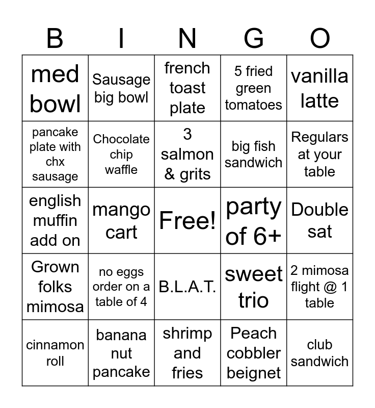 This bingo card has a free space and 34 words: steak & chicken @ 1 table, Peach cobbler beignet, guests comments on how big the pancakes are, 2 fish & grits @ 1 table, Grown folks mimosa, Chocolate chip waffle, vanilla latte, cinnamon roll, Sausage big bowl, veggie Q bowl, 3 salmon & grits, french toast plate, bottle and juice upsell, banana foster pancake, party of 6+, Regulars at your table, banana nut pancake, english muffin add on, no eggs order on a table of 4, sweet trio, B.L.A.T., add 2 eggs to a plate, med bowl, Double sat, shrimp and fries, club sandwich, 5 fried green tomatoes, hot chocolate, big fish sandwich, pancake plate with chx sausage, s&s beignets, mango cart, 2 mimosa flight @ 1 table and prickly pear mimosa.