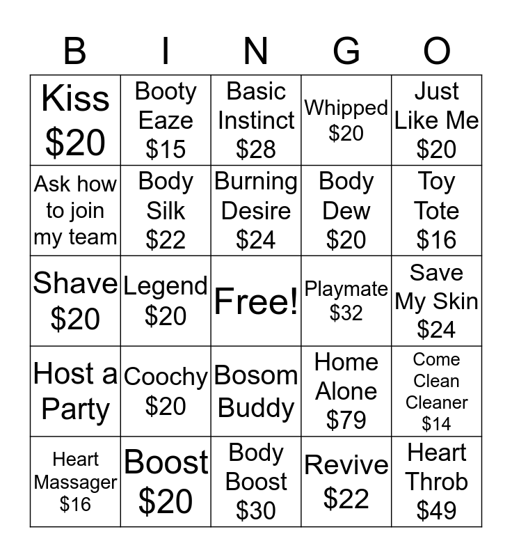 This bingo card has a free space and 24 words: Coochy $20, Boost $20, Burning Desire $24, Heart Massager $16, Just Like Me $20, Kiss $20, Ask how to join my team, Booty Eaze $15, Playmate $32, Bosom Buddy, Body Dew $20, Shave $20, Home Alone $79, Come Clean Cleaner $14, Body Silk $22, Revive $22, Save My Skin $24, Basic Instinct $28, Toy Tote $16, Legend $20, Heart Throb $49, Host a Party, Whipped $20 and Body Boost $30.