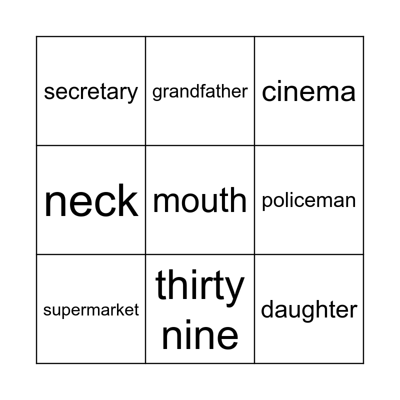 This bingo card has 9 words: supermarket, cinema, grandfather, neck, secretary, policeman, mouth, daughter and thirty nine.