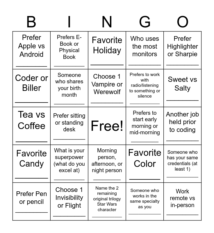 This bingo card has a free space and 24 words: What is your superpower (what do you excel at) __________, Choose 1 Invisibility or Flight _________, Choose 1 Vampire or Werewolf _________, Prefer Pen or pencil _________, Prefer Highlighter or Sharpie _________, Prefer Apple vs Android ________, Coder or Biller _______, Prefers E-Book or Physical Book __________, Prefers to start early morning or mid-morning _________, Morning person, afternoon, or night person _________, Prefers to work with radio/listening to something or silence ____________, Tea vs Coffee ______, Favorite Color ______, Someone who has your same credentials (at least 1) ____________, Someone who shares your birth month __________, Someone who works in the same specialty as you _____________, Another job held prior to coding _________, Favorite Holiday _______, Sweet vs Salty ________, Prefer sitting or standing desk __________, Work remote vs in-person __________, Favorite Candy _______, Who uses the most monitors _________ and Name the 2 remaining original trilogy Star Wars character ____________.