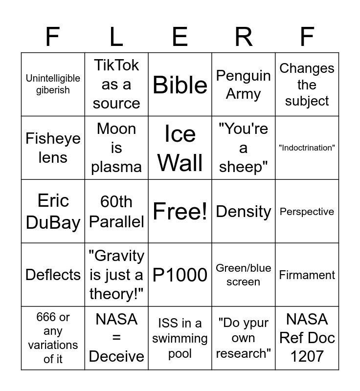 This bingo card has a free space and 41 words: 8"/mi², Eric DuBay, Moon is a reflection, Moon is plasma, NASA = Deceive, P1000, Ice Wall, "Nuh-uh!", Changes the subject, Deflects, 60th Parallel, Penguin Army, NASA Ref Doc 1207, Perspective, Density, "Gravity is just a theory!", Word Salad, Unintelligible giberish, "The Jab", Bible, Firmament, Scientism or Sciance is a religion, ISS in a swimming pool, "You're a sheep", Water always finds its level, Insults, "Do ypur own research", "How'd they fit the buggy?", "Indoctrination", Operation Fishbowl, YouTube as a source, TikTok as a source, 666 or any variations of it, "SatelLIES", Green/blue screen, Fisheye lens, "Where are the stars?", "AstroNOTS", "Show me a picture of the whole earth!", "CGI" and Planes have to point their nose down.