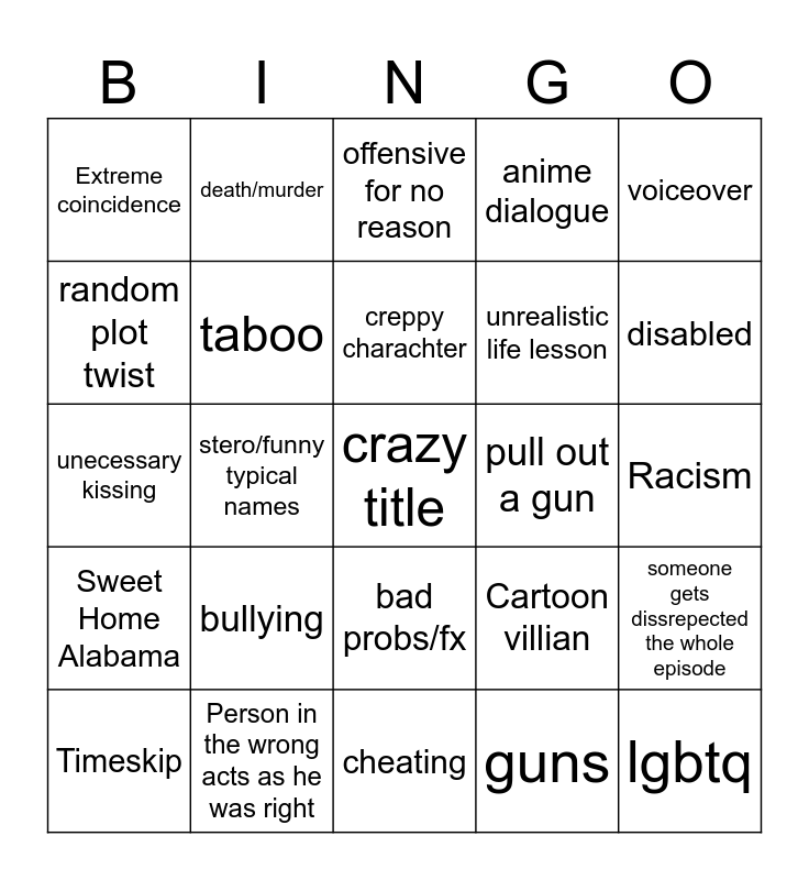 This bingo card has a free space and 24 words: Timeskip, bullying, creppy charachter, guns, voiceover, Extreme coincidence, death/murder, offensive for no reason, pull out a gun, Racism, unecessary kissing, taboo, Cartoon villian, someone gets dissrepected the whole episode, random plot twist, Person in the wrong acts as he was right, cheating, anime dialogue, disabled, Sweet Home Alabama, stero/funny typical names, bad probs/fx, unrealistic life lesson and lgbtq.