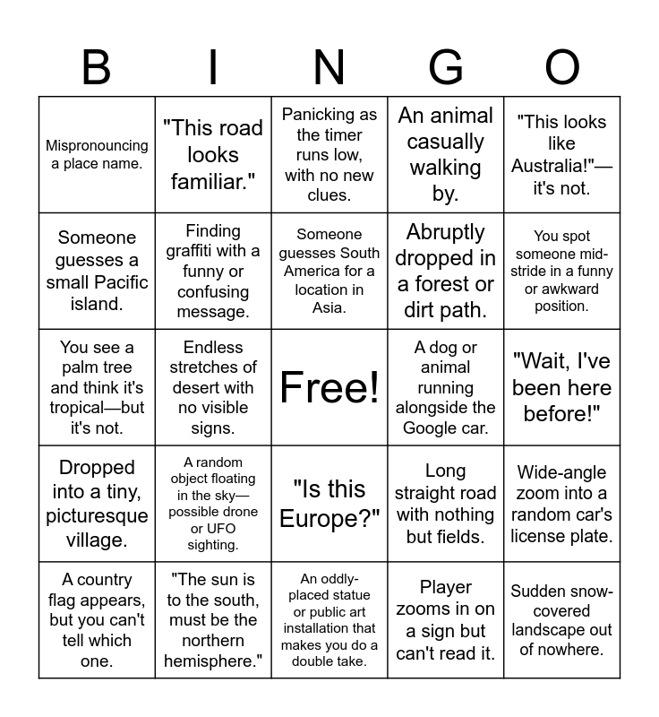 This bingo card has a free space and 26 words: "Is this Europe?", Player zooms in on a sign but can't read it., Someone guesses South America for a location in Asia., "The sun is to the south, must be the northern hemisphere.", "This looks like Australia!"—it's not., Mispronouncing a place name., Someone guesses a small Pacific island., "This road looks familiar.", "Wait, I've been here before!", Long straight road with nothing but fields., Abruptly dropped in a forest or dirt path., You see a palm tree and think it's tropical—but it's not., Wide-angle zoom into a random car's license plate., A country flag appears, but you can't tell which one., Endless stretches of desert with no visible signs., Mountain range in the background but no other hints., An animal casually walking by., Dropped into a tiny, picturesque village., Panicking as the timer runs low, with no new clues., Sudden snow-covered landscape out of nowhere., You spot someone mid-stride in a funny or awkward position., An oddly-placed statue or public art installation that makes you do a double take., A dog or animal running alongside the Google car., A random object floating in the sky—possible drone or UFO sighting., Finding graffiti with a funny or confusing message. and The Google car itself is reflected in a glass window or building..