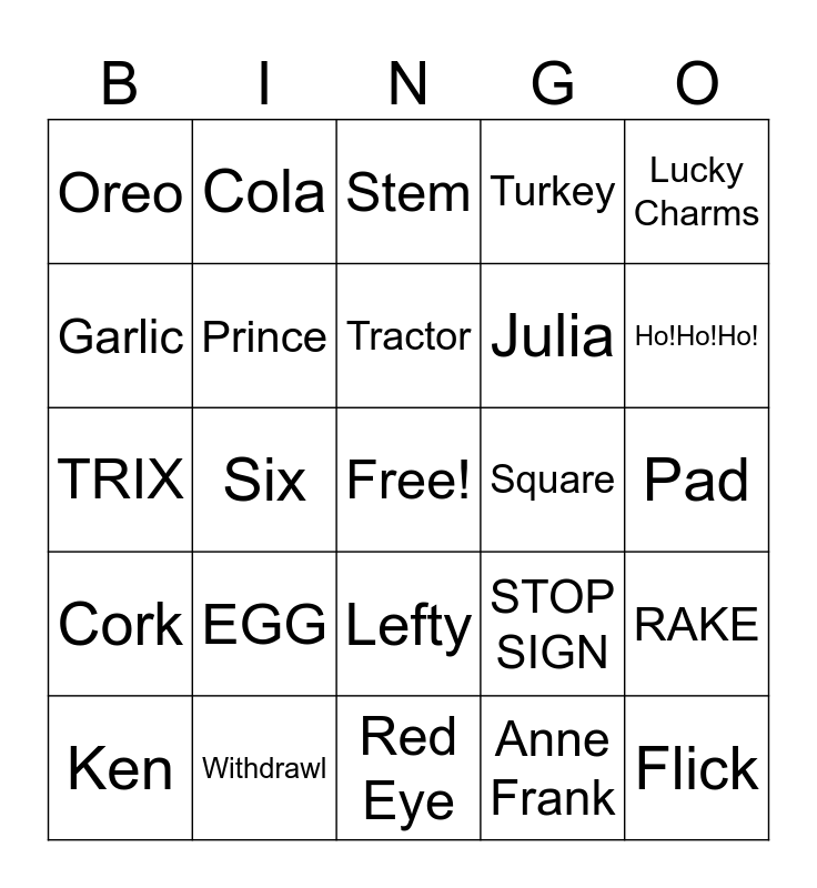 This bingo card has a free space and 24 words: EGG, Withdrawl, Tractor, Ken, Lucky Charms, Oreo, Garlic, Cola, Square, Lefty, Julia, TRIX, STOP SIGN, RAKE, Prince, Anne Frank, Pad, Stem, Ho!Ho!Ho!, Six, Flick, Cork, Turkey and Red Eye.