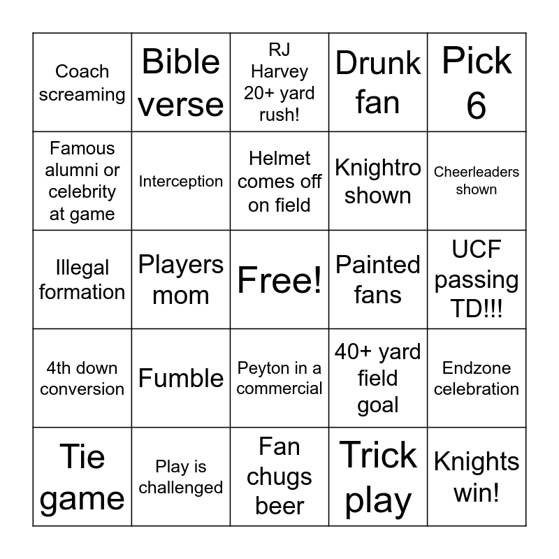 This bingo card has a free space and 24 words: Fumble, Play is challenged, Helmet comes off on field, Tie game, Pick 6, Coach screaming, Famous alumni or celebrity at game, Bible verse, Painted fans, Peyton in a commercial, Knightro shown, Illegal formation, 40+ yard field goal, Endzone celebration, Interception, Trick play, UCF passing TD!!!, RJ Harvey 20+ yard rush!, Cheerleaders shown, Players mom, Knights win!, 4th down conversion, Drunk fan and Fan chugs beer.