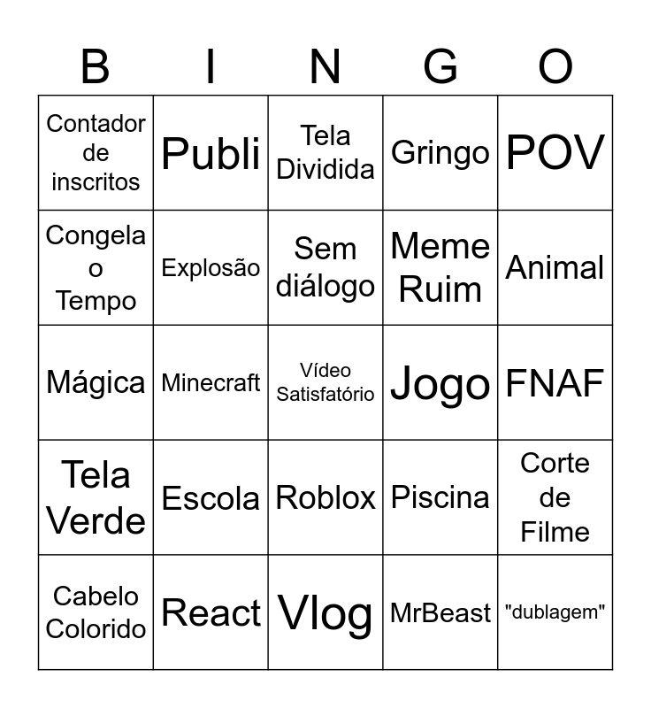This bingo card has a free space and 24 words: Escola, React, Sem diálogo, Cabelo Colorido, POV, Contador de inscritos, Congela o Tempo, Publi, Jogo, Roblox, Meme Ruim, Mágica, Piscina, Corte de Filme, Explosão, MrBeast, FNAF, Tela Dividida, Animal, Minecraft, "dublagem", Tela Verde, Gringo and Vlog.