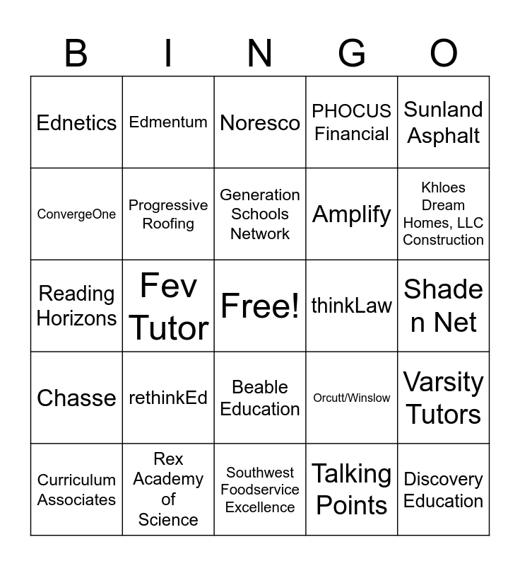This bingo card has a free space and 54 words: IXL Learning, Chasse, Sodexo, Rex Academy of Computer Science, Beable Education, Grand Canyon University, PHOCUS Financial, 7 Mindsets, ConvergeOne, DreamBox, Ednetics, Core Construction, Rex Academy of Science, Curriculum Associates, SchoolSims, Southwest Foodservice Excellence, Discovery Education, Amplify, DLR Group, Shade n Net, Orcutt/Winslow, Skyline Builders & Restoration, thinkLaw, Sunland Asphalt, Benson Systems, Edmentum, SSC Services for Education/Chartwells, McGraw-Hill Education, International Alliance Group, Talking Points, Graduation Solutions, Imagine Learning, SPS & Architects, GCON, Noresco, McCarthy, Reading Horizons, Varsity Tutors, Edison Learning, Progressive Roofing, Renaissance, ASBAIT, Rytan LLC, Pueblo Mechanical & Controls, rethinkEd, Learning.com, Veregy, Pfm, Generation Schools Network, Fev Tutor, Khloes Dream Homes, LLC Construction, Stifel, Nicolaus & Company, Inc., Wholesale Floors and Hellas Construction Sibme.