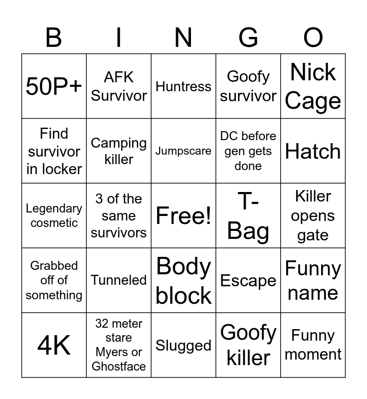 This bingo card has a free space and 24 words: Tunneled, 32 meter stare Myers or Ghostface, Jumpscare, 4K, Nick Cage, 50P+, Find survivor in locker, AFK Survivor, T-Bag, Body block, DC before gen gets done, Legendary cosmetic, Escape, Funny name, Camping killer, Goofy killer, Killer opens gate, Huntress, Hatch, 3 of the same survivors, Funny moment, Grabbed off of something, Goofy survivor and Slugged.