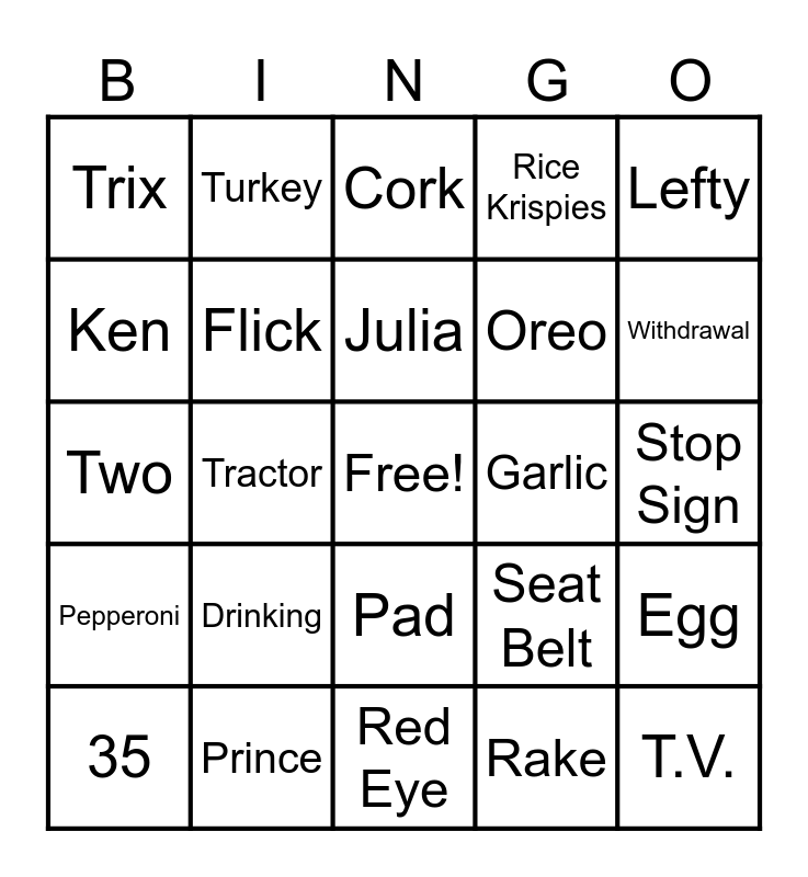 This bingo card has a free space and 24 words: Drinking, Prince, Julia, 35, Lefty, Trix, Ken, Turkey, Garlic, Pad, Oreo, Two, Seat Belt, Egg, Flick, Rake, Stop Sign, Cork, Withdrawal, Tractor, T.V., Pepperoni, Rice Krispies and Red Eye.