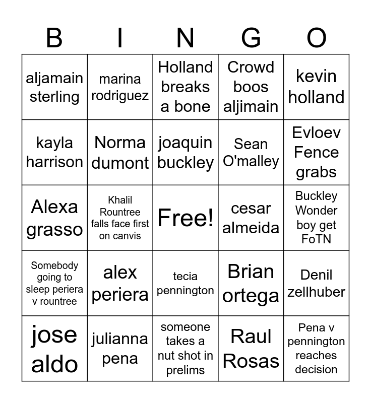 This bingo card has a free space and 24 words: alex periera, julianna pena, joaquin buckley, jose aldo, kevin holland, aljamain sterling, kayla harrison, marina rodriguez, cesar almeida, tecia pennington, Sean O'malley, Alexa grasso, Brian ortega, Denil zellhuber, Norma dumont, Raul Rosas, Buckley Wonder boy get FoTN, Holland breaks a bone, Evloev Fence grabs, Khalil Rountree falls face first on canvis, Pena v pennington reaches decision, Somebody going to sleep periera v rountree, Crowd boos aljimain and someone takes a nut shot in prelims.