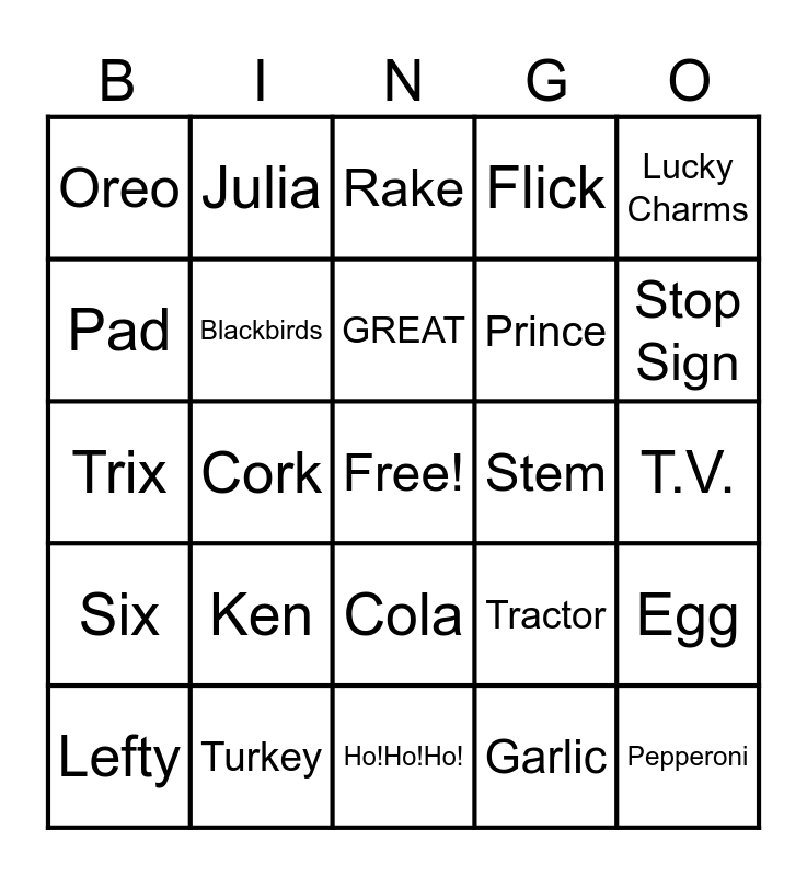 This bingo card has a free space and 24 words: Ken, Turkey, GREAT, Lefty, Lucky Charms, Oreo, Pad, Julia, Stem, Cola, Prince, Trix, Tractor, Egg, Blackbirds, Garlic, T.V., Rake, Stop Sign, Cork, Pepperoni, Six, Flick and Ho!Ho!Ho!.