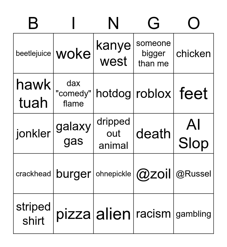 This bingo card has a free space and 24 words: burger, pizza, hotdog, striped shirt, chicken, beetlejuice, hawk tuah, woke, death, ohnepickle, roblox, jonkler, @zoil, @Russel, dax "comedy" flame, racism, AI Slop, kanye west, feet, galaxy gas, gambling, crackhead, someone bigger than me and alien.