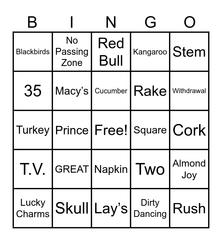 This bingo card has a free space and 24 words: GREAT, Skull, Cucumber, Lucky Charms, Stem, Blackbirds, 35, No Passing Zone, Square, Napkin, Rake, Turkey, Two, Almond Joy, Macy’s, Dirty Dancing, Cork, Red Bull, Withdrawal, Prince, Rush, T.V., Kangaroo and Lay’s.