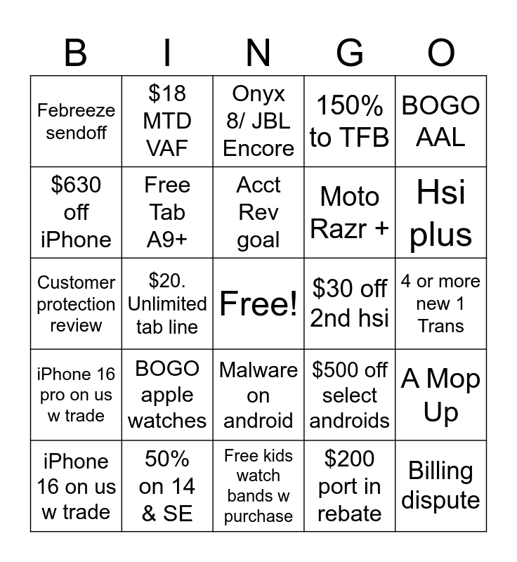 This bingo card has a free space and 29 words: iPhone 16 on us w trade, 125% to rev, $20. Unlimited tab line, Pixel 8a on us w act, Febreeze sendoff, Onyx 8/ JBL Encore, Free Tab A9+, BOGO apple watches, $30 off 2nd hsi, 50% on 14 & SE, 4 or more new 1 Trans, Billing dispute, Free kids watch bands w purchase, $200 port in rebate, Hsi plus, Keep & switch, Malware on android, iPhone 16 pro on us w trade, BOGO AAL, Customer protection review, $500 off select androids, 3/$6 sync up tracker, Moto Razr +, $630 off iPhone, 150% to TFB, $18 MTD VAF, A Mop Up, Acct Rev goal and Line goal by 22nd.