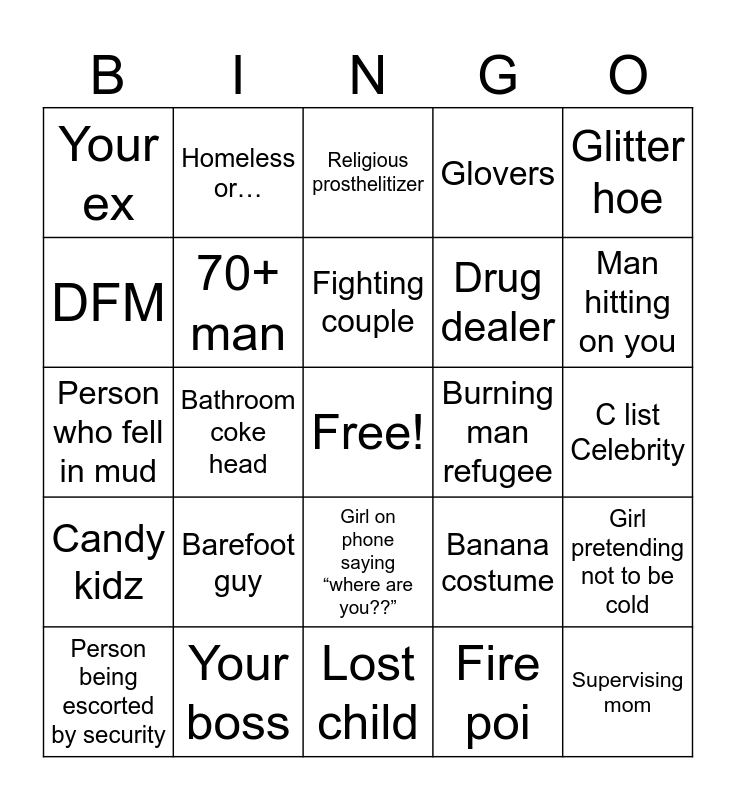This bingo card has a free space and 25 words: Barefoot guy, Lost child, Fighting couple, Person being escorted by security, Glitter hoe, Your ex, DFM, Homeless or…, Burning man refugee, Girl on phone saying “where are you??”, Drug dealer, Person who fell in mud, Banana costume, Girl pretending not to be cold, 70+ man, Lost wallet, C list Celebrity, Religious prosthelitizer, Man hitting on you, Bathroom coke head, Supervising mom, Your boss, Candy kidz, Glovers and Fire poi.