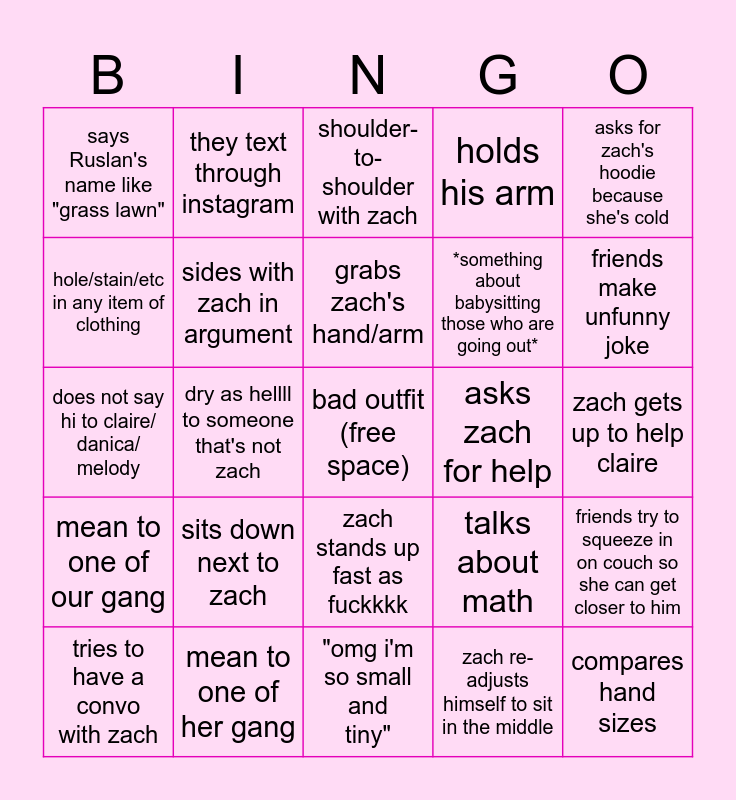 This bingo card has a free space and 29 words: tries to have a convo with zach, mean to Claire, dry as hellll to someone that's not zach, leans head on zach's shoulder, says Ruslan's name like "grass lawn", shoulder-to-shoulder with zach, sides with zach in argument, sits down next to zach, asks zach for help, mean to one of her gang, zach gets up to help claire, compares hand sizes, "omg i'm so small and tiny", zach re-adjusts himself to sit in the middle, friends make unfunny joke, takes the moral high ground, zach stands up fast as fuckkkk, mean to one of our gang, asks for zach's hoodie because she's cold, does not say hi to claire/ danica/ melody, talks about math, gets up to let one of her girls in, *something about babysitting those who are going out*, hole/stain/etc in any item of clothing, holds his arm, they text through instagram, friends try to squeeze in on couch so she can get closer to him, grabs zach's hand/arm and gets up to readjust self to sit closer to zach.