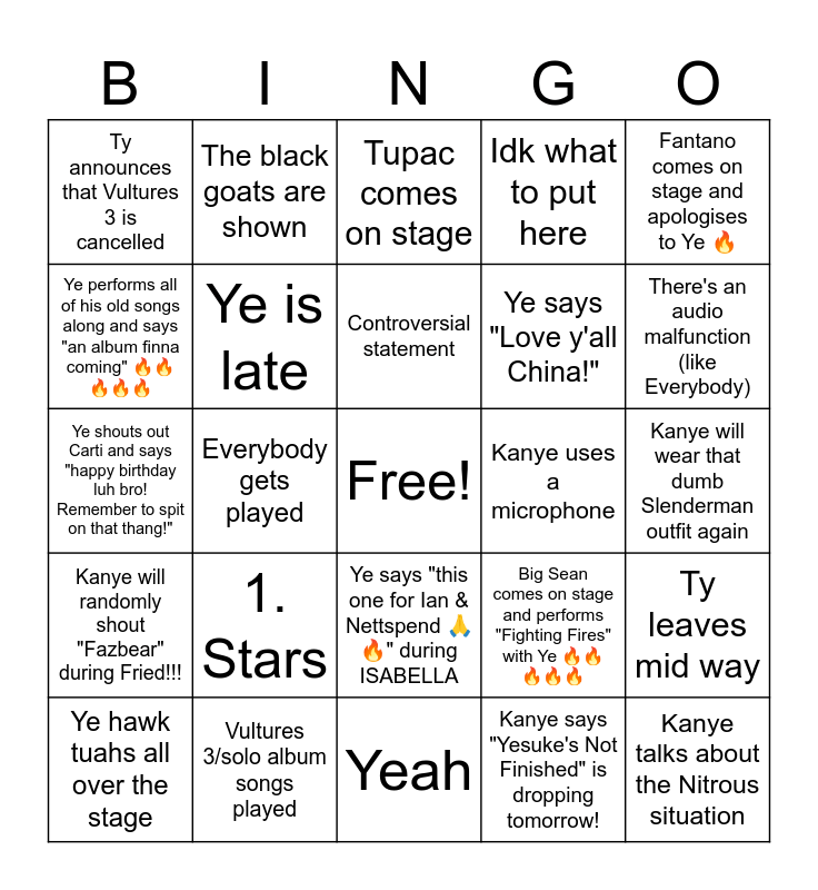 This bingo card has a free space and 24 words: 1. Stars, Vultures 3/solo album songs played, Controversial statement, Ye hawk tuahs all over the stage, Fantano comes on stage and apologises to Ye 🔥, Ty announces that Vultures 3 is cancelled, Ye performs all of his old songs along and says "an album finna coming" 🔥🔥🔥🔥🔥, The black goats are shown, Kanye uses a microphone, Ye says "this one for Ian & Nettspend 🙏🔥" during ISABELLA, Ye says "Love y'all China!", Ye shouts out Carti and says "happy birthday luh bro! Remember to spit on that thang!", Big Sean comes on stage and performs "Fighting Fires" with Ye 🔥🔥🔥🔥🔥, Ty leaves mid way, Ye is late, Kanye says "Yesuke's Not Finished" is dropping tomorrow!, Kanye will wear that dumb Slenderman outfit again, Tupac comes on stage, There's an audio malfunction (like Everybody), Everybody gets played, Kanye talks about the Nitrous situation, Kanye will randomly shout "Fazbear" during Fried!!!, Idk what to put here and Yeah.