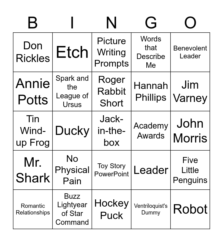 This bingo card has 130 words: Rocky, Etch, Lenny, Magic 8-Ball, Mike, Farmer Says See 'n Say, Mr. Shark, Mr. Spell, Robot, Snake, Troikas, Toddle Tots, Free!, Troll Doll, Barrel of Monkeys, Roly-Poly Clown, Hockey Puck, Andy Davis, Mrs. Davis, Molly Davis, Sid Phillips, Hannah Phillips, Scud, Mrs. Philips, Babyface, Legs, Jack-in-the-box, RollerBob, Rockmobile, Pump Boy, Tin Wind-up Frog, Ducky, Jingle Joe, Toy Story, Sentient Toys, 1995, Computer-Generated Imagery, $3.3 Billion, Rotten Tomatoes, Golden Globe, Academy Awards, Buzz Lightyear's Space Ranger Spin, Unique Biology, Invulnerable, No Organs, Crippled, Self-Sustaining, No Physical Pain, Makeshift Body Parts, Leader, Storage, Romantic Relationships, Animate Themselves, Cannot Talk to Humans, Mess Makers, Mint Condition, Repair Themselves, Cannot Leave Owners, John Lasseter, El Capitan Theatre, Randy Newman, You've Got a Friend in Me, Pixar's First Feature Film, Tom Hanks, Tim Allen, Don Rickles, Wallace Shawn, John Ratzenberger, Jim Varney, Annie Potts, R. Lee Ermey, John Morris, Laurie Metcalf, Erik von Detten, Sarah Freeman, Toy Story 2, Toy Story 3, Toy Story 4, Toy Story 5, Tin Toy, Ventriloquist's Dummy, Benevolent Leader, Universal Acclaim, Number One Movie, Roger Rabbit Short, Toy Story Treats, Buzz Lightyear of Star Command, Toy Story Toons, Action Figures, 25 Million Units, Toy Story Vocabulary, Old Friends, New Friends, Toy Story PowerPoint, Toy Story Word Work, Rex Colors, Favorite Character Worksheet, Game and Toy Craft Worksheets, Picture Writing Prompts, Spark and the League of Ursus, PONG Coloring Page, Picture Reading Activity, Short Storybook, Words that Describe Me, Emergent Reader Writing Prompts, Rescue Kitty, Kinder & 1st Grade Writing Center, Five Little Penguins, Jordin! You Forgot One, Spelling Guide for Writers, Bugs Vocabulary Sheet, Toy Story Characters, Inspirational Words, Toy Story Products, STREAM TOY STORY, Unfamiliar Territory, The New Toy, Skyrocket, Woody Mocks Buzz, Crash Landing, Alien Contact, Toy Story Franchise, Animated Feature Films, $720 Million, Third Highest-Grossing, Critically Acclaimed, 100% Rating, Golden Globe Winner, Best Animated Feature, Theme Park Attraction and Unique Psychology.
