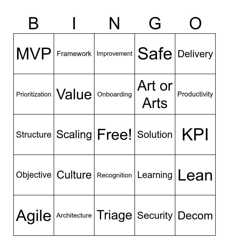 This bingo card has a free space and 33 words: Transformation, Optimize, Scaling, Integrate, Objective, Value, Delivery, Agile, Framework, Technology, Onboarding, Improvement, Customers, Engagement, Solution, Productivity, Architecture, Structure, Culture, Learning, Recognition, Development, MVP, KPI, Triage, Decom, Safe, Art or Arts, Prioritization, Lean, Journey, Security and Funding.
