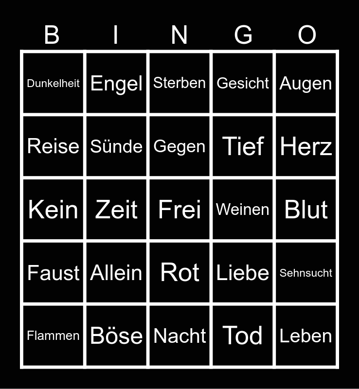 This bingo card has a free space and 24 words: Allein, Böse, Gegen, Flammen, Augen, Dunkelheit, Reise, Engel, Weinen, Rot, Tief, Kein, Liebe, Sehnsucht, Sünde, Tod, Blut, Sterben, Herz, Zeit, Leben, Faust, Gesicht and Nacht.