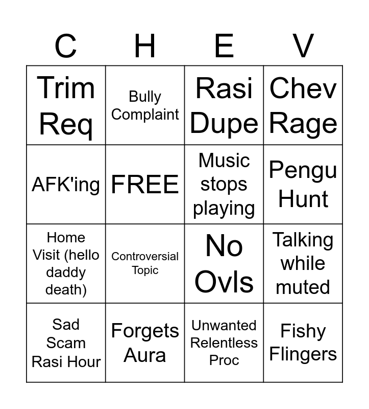 This bingo card has 16 words: Forgets Aura, Talking while muted, Rasi Dupe, Trim Req, Home Visit (hello daddy death), Bully Complaint, No Ovls, Unwanted Relentless Proc, AFK'ing, FREE, Sad Scam Rasi Hour, Chev Rage, Controversial Topic, Pengu Hunt, Music stops playing and Fishy Flingers.
