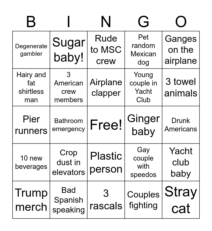 This bingo card has a free space and 24 words: Crop dust in elevators, Bad Spanish speaking, Airplane clapper, Trump merch, Ganges on the airplane, Degenerate gambler, Hairy and fat shirtless man, Sugar baby!, Ginger baby, Plastic person, Young couple in Yacht Club, Pier runners, Gay couple with speedos, Yacht club baby, 3 American crew members, Couples fighting, Drunk Americans, Rude to MSC crew, 3 towel animals, Bathroom emergency, Stray cat, 10 new beverages, Pet random Mexican dog and 3 rascals.
