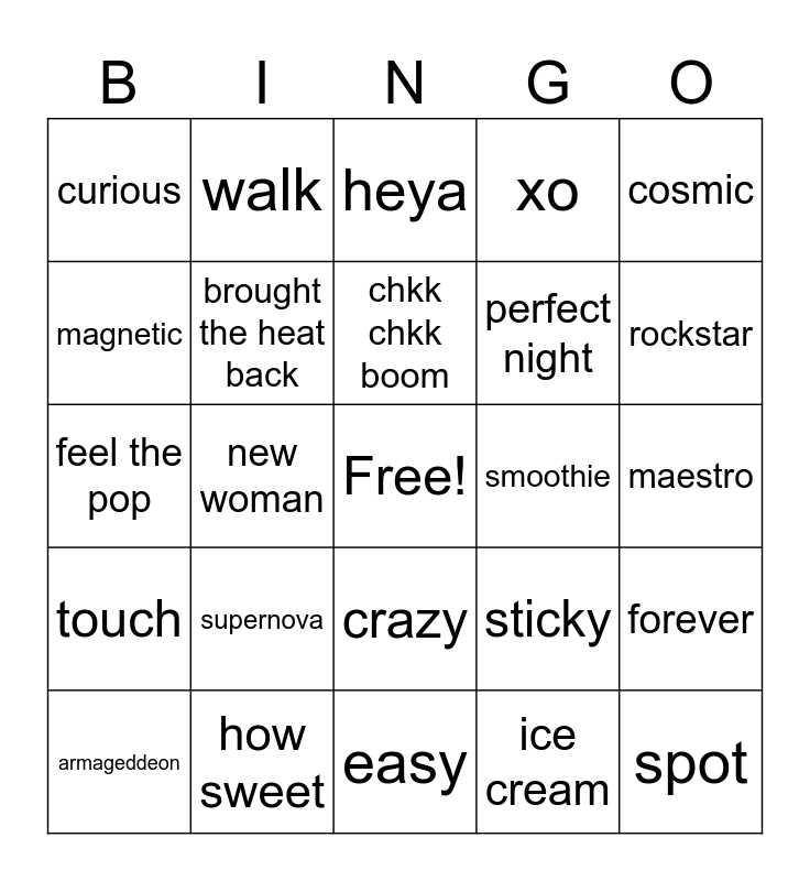 This bingo card has a free space and 24 words: supernova, how sweet, chkk chkk boom, armageddeon, cosmic, curious, magnetic, walk, smoothie, crazy, perfect night, feel the pop, sticky, forever, brought the heat back, ice cream, maestro, heya, rockstar, new woman, spot, touch, xo and easy.